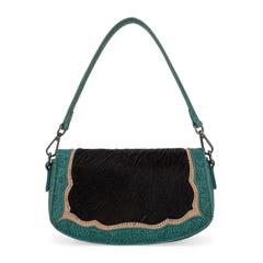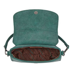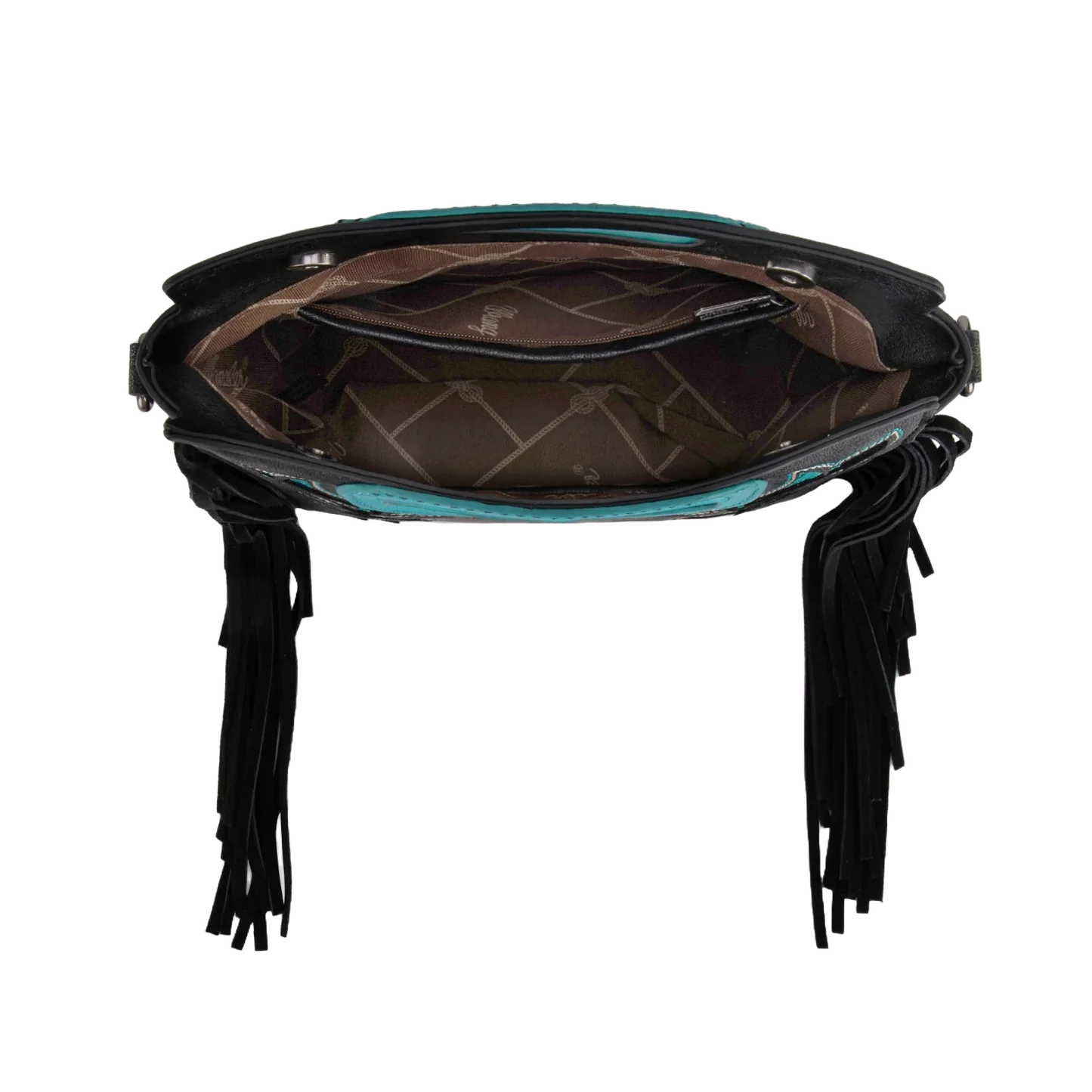 Montana West Genuine Leather Tooled Fringe Crossbody-Black and Teal