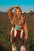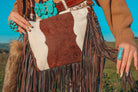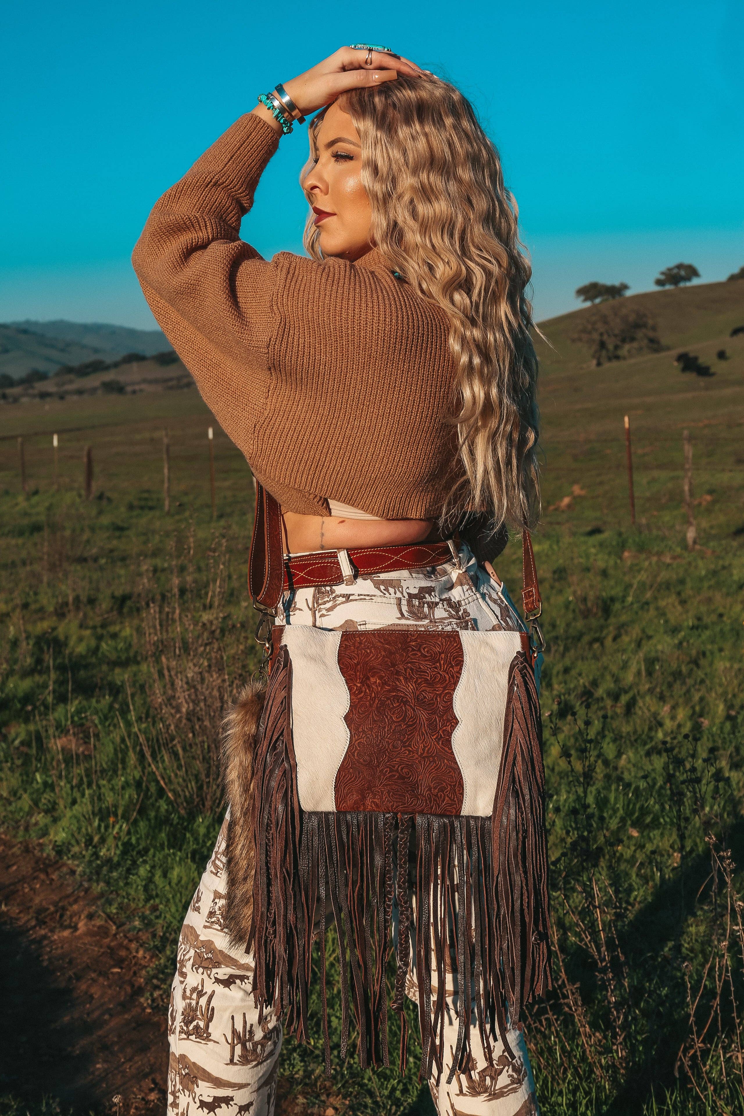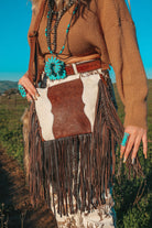 This charming genuine leather purse features creamy white cowhide with soft hair-on texture, accented by woven fringe and a braided twist for a fun flair. The back sports two vertical zippers and a handy pocket. Its embossed leather strap adjusts easily for shoulder or crossbody wear. Measuring about 13"x9" (give or take a bit), the inside includes a zipper pocket to keep your essentials secure. *Tail accessory sold separately.