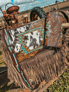 Hi, I’m Beth Marie, the creative mind behind this purse and all the pieces in my collection. This purse stands out with its one-of-a-kind Aztec tooling you won’t find anywhere else. Inside, it’s fully lined and features a zipper pocket, plus a roomy back pocket perfect for stashing your phone or keys. Each purse is crafted from a unique cowhide, making every piece truly special. Wallets are sold separately and can be added on. Size-wise, it measures about 14.5" long by 10" high. Get ready to turn heads with this standout accessory!
