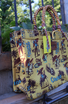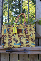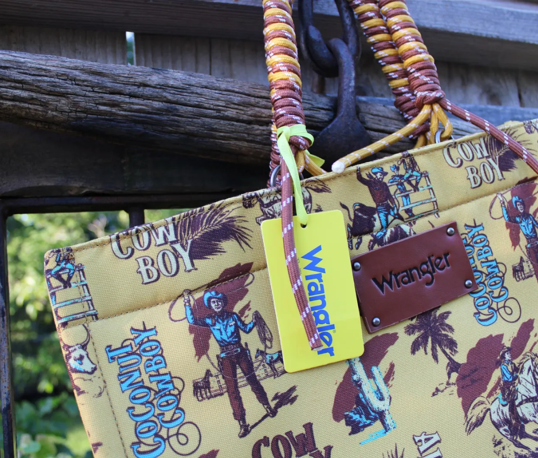 The Rooster Den Co presents a stylish take on the classic cowboy motif with the Wrangler Vintage Canvas Tote Bag. This versatile tote has ample space for your daily essentials, making it perfect for use as a carry-all, weekender or travel bag. Plus, with the Wrangler cowboy dual-sided print in a retro yellow print, it's a unique and eye-catching accessory.