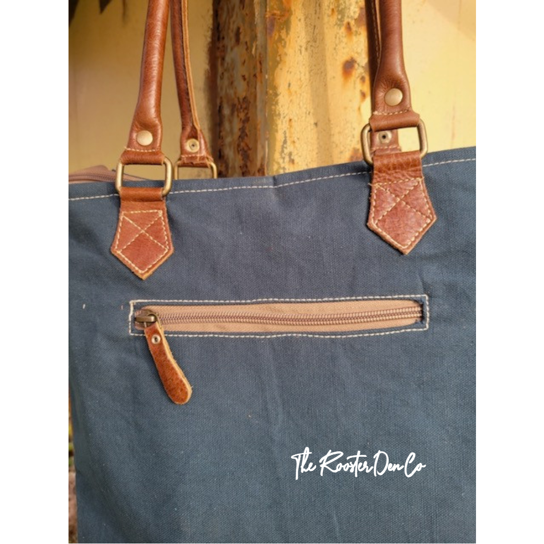Dare to be different with The Rooster Den Co's unique Western Canvas Leather Tote Bag by Myra. This eye-catching piece screams Cowgirl with its embroidered front design, leather stitching and fringe accent that adds a dramatic flair. And let's not forget the convenient zippered pocket on the back and leather shoulder carrying handles. Don't miss out on this amazing bag!
