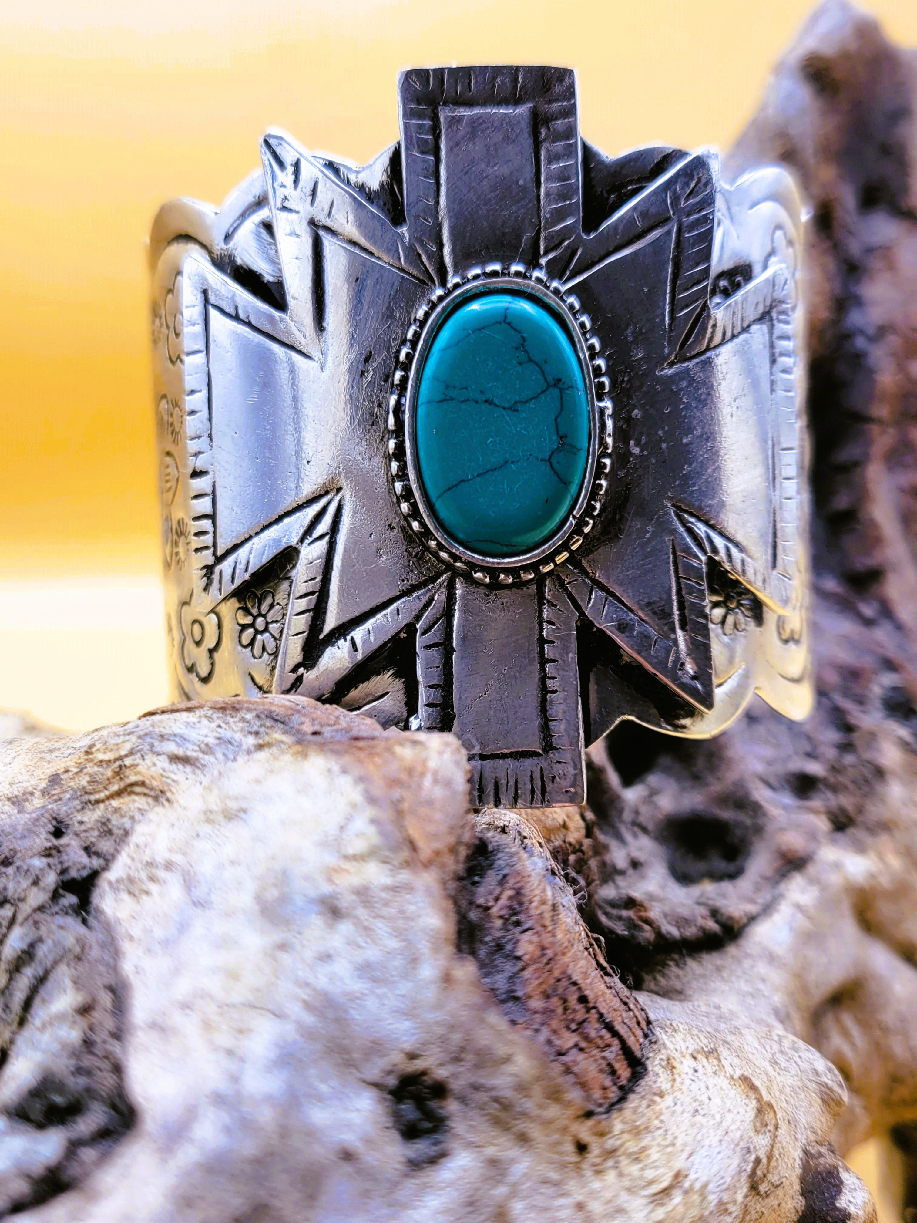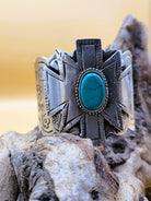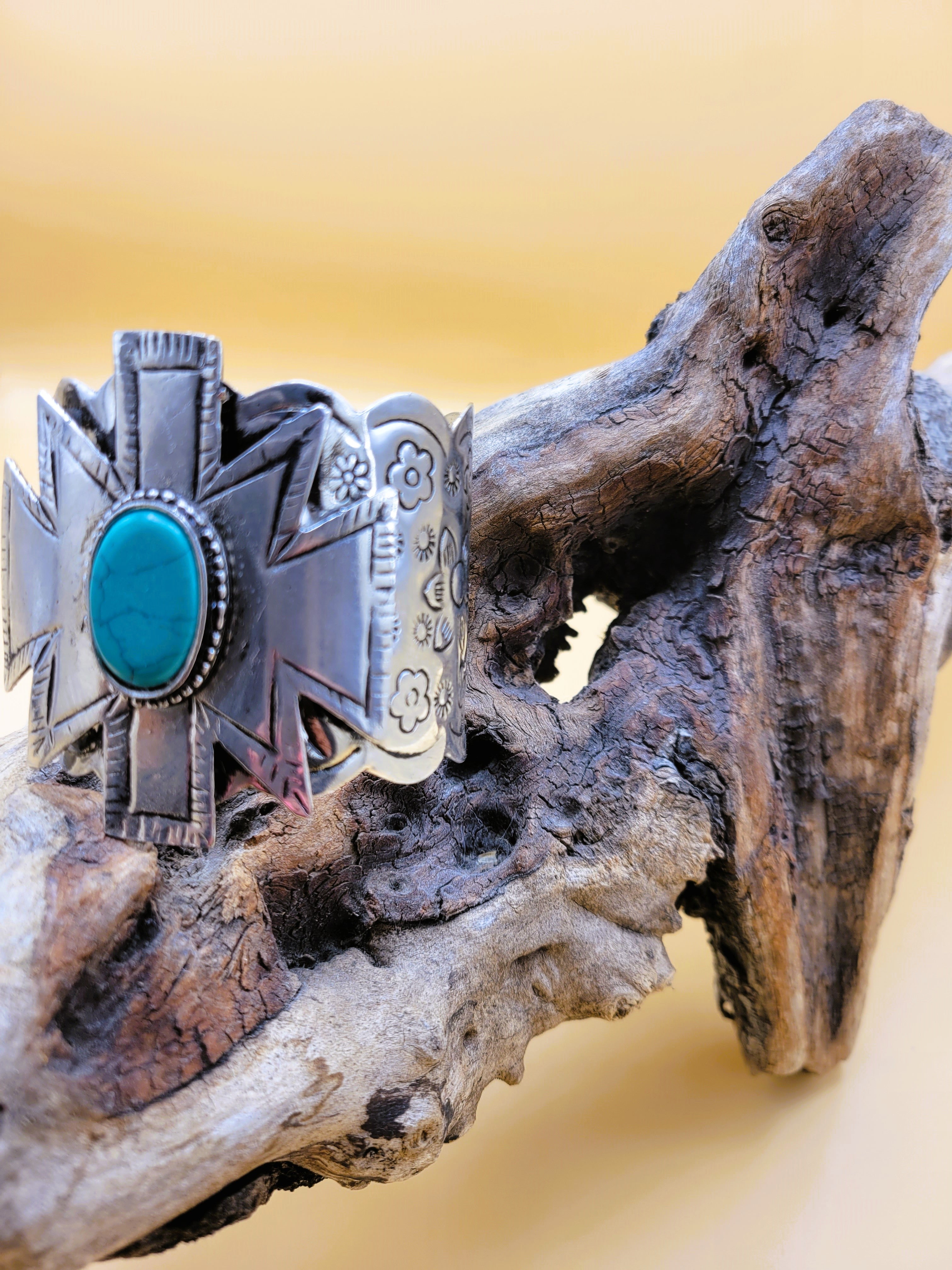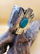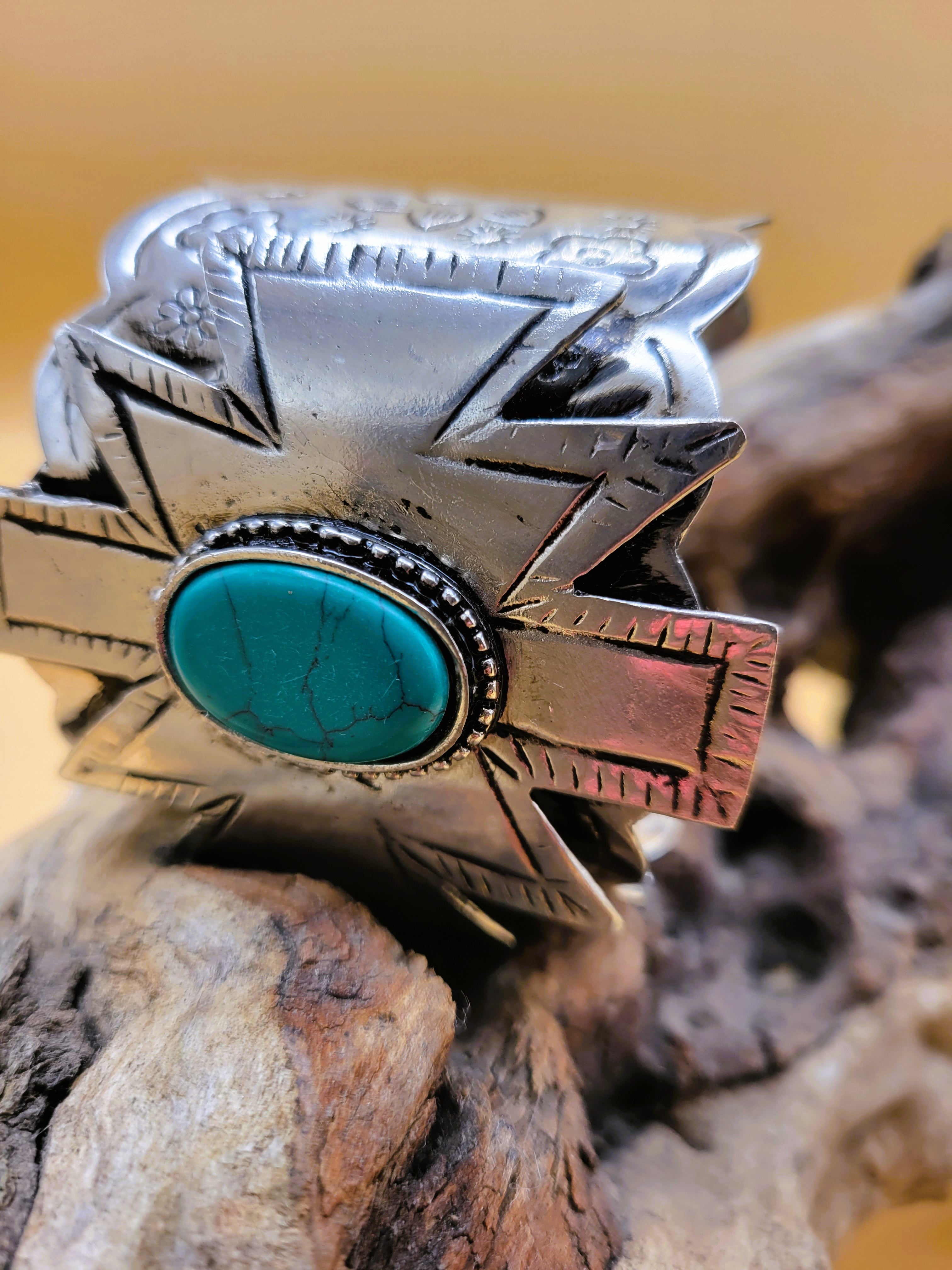 Get ready to channel your inner cowgirl with The Rooster Den Co's Western Cuff Turquoise Bracelet! This stunning piece features intricate artisan details and a gorgeous synthetic turquoise stone, all inspired by the majestic thunderbird taking flight. The scrolling design adds a touch of playful flair, making it the perfect statement accessory for any Southwest-inspired outfit. It's a cowgirl chic must-have!