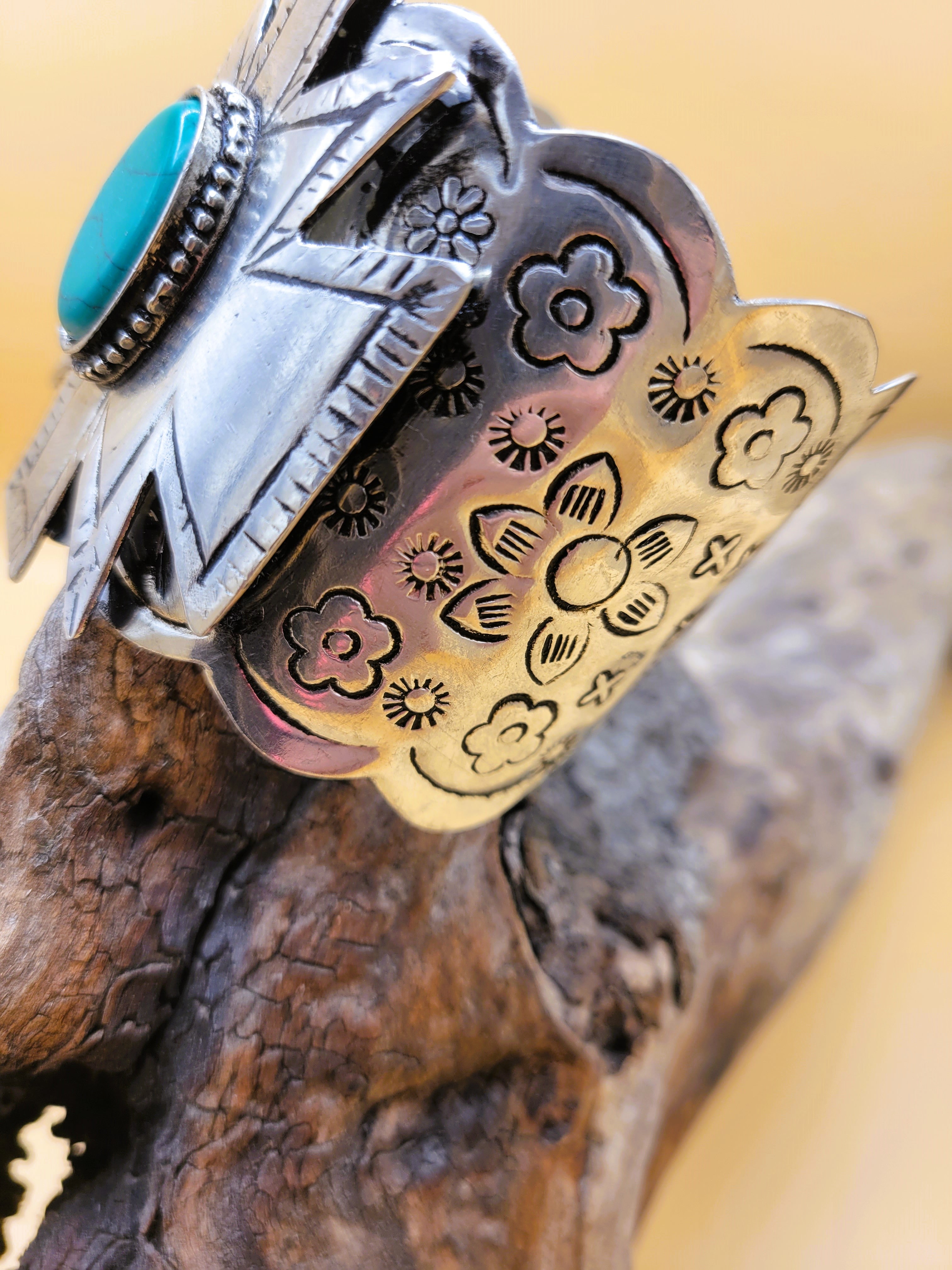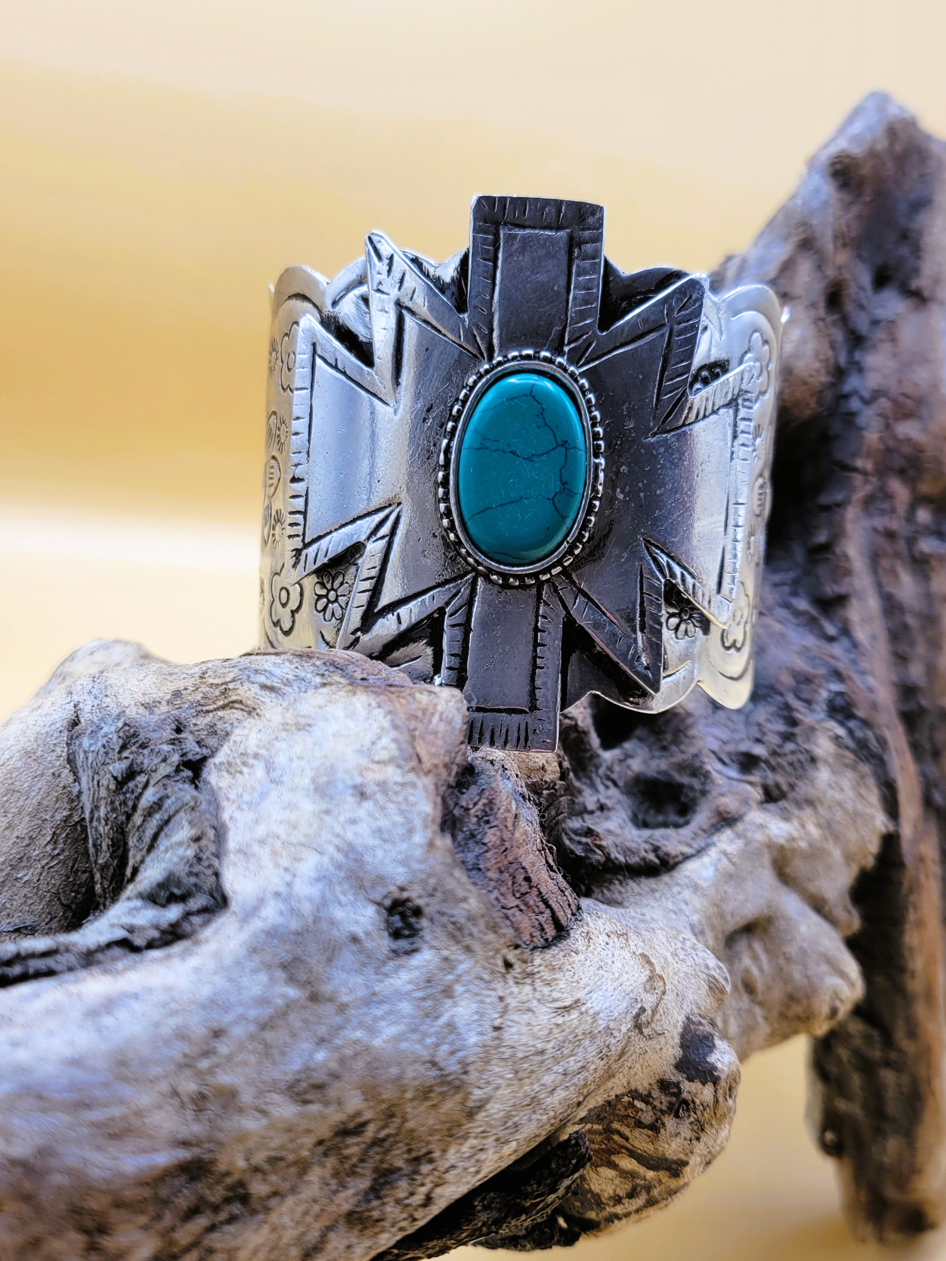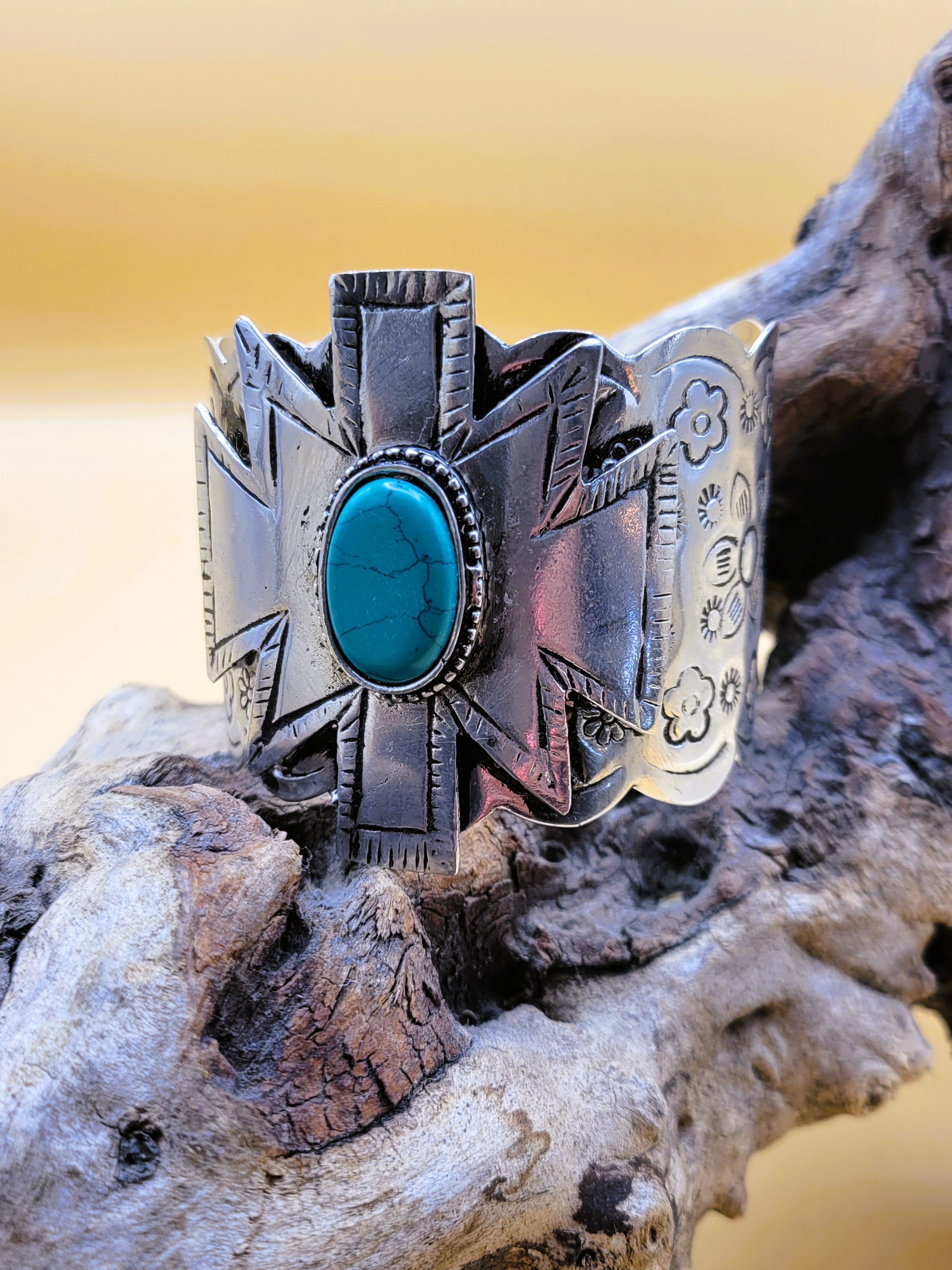 Get ready to channel your inner cowgirl with The Rooster Den Co's Western Cuff Turquoise Bracelet! This stunning piece features intricate artisan details and a gorgeous synthetic turquoise stone, all inspired by the majestic thunderbird taking flight. The scrolling design adds a touch of playful flair, making it the perfect statement accessory for any Southwest-inspired outfit. It's a cowgirl chic must-have!